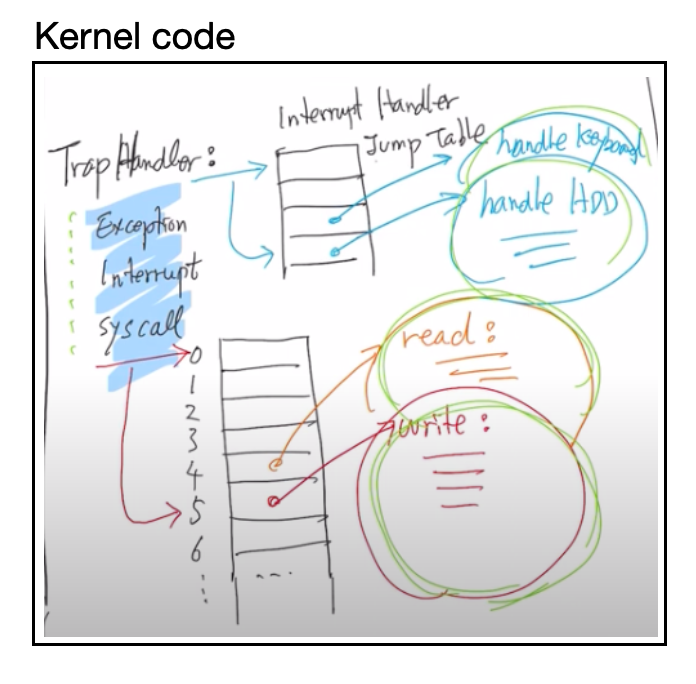kernel 코드에는 Trap handler에 대한 indirect jump table이 있습니다. 즉, jump table의 element들은 모두 포인터들이고, 저장되어있는 값을 통해서 메모리주소를 얻고, 그 주소로 jump를 하게 되면 필요한 작업을 수행하는 코드가 있는 곳으로 갈 수 있습니다.