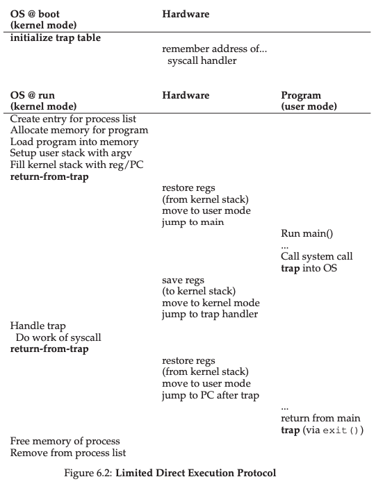 - Kernel mode OS: 프로세스를 만들어놓고 main()과 같은 entry point에 대한 정보(명령어의 메모리주소)를 kernel stack에 넣어놓고 return-from-trap 명령어 호출