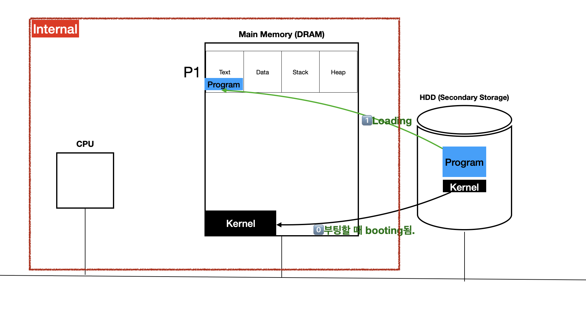 Program 소스프로그램에서 컴파일에서 얻은 실행 파일을 말하고, 이것은 HDD, SDD 저장장치에 저장됩니다. 저장장치에 저장되어있던 프로그램이 실행되려면 메인 메모리로 loading되어야합니다. 어째