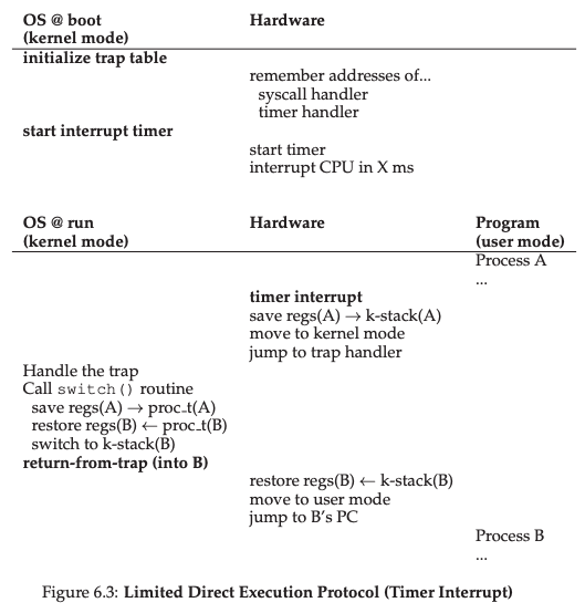 한가지는 협력적인 프로세스를 믿어보는 방법 그리고 한가지는 Timer를 두고 일정 시간이 지나면 프로세스의 권한을 운영 체제가 뺏어오는 방법인데, 첫번째 방법은 너무 수동적이라 후자를 선택하고 있습니다.