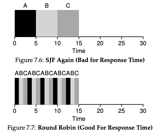 사실 STCF와 관련된 방법론은 응답 시간에는 특히 좋지 않습니다. 예를 들어, 세 개의 작업이 동시에 도착하면, 세 번째 작업은 전체적으로 실행되기를 기다려야 하며 그 전 두 작업이 한 번씩 예약되어야 합니다. 반환 시간(turnaround time)에는 효과적일지 모르지만, 이 접근 방식은 응답 시간(response time)과 상호작용성에는 상당히 나쁩니다.