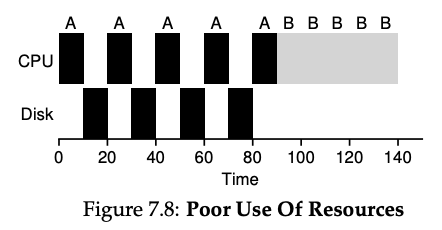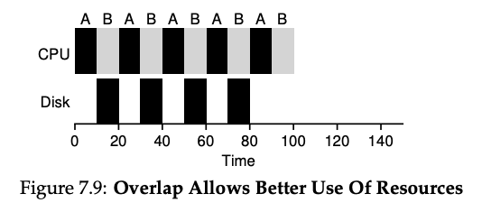 그런 다음 A의 새로운 10ms 하위 작업이 제출되고 B를 선점하여 10ms 동안 실행됩니다. 이렇게 하면 CPU가 다른 프로세스의 I/O 완료를 기다리는 동안, 다른 프로세스에 의해 사용되어 중첩이 가능하며, 시스템은 더 효율적으로 활용됩니다. (Figure 7.9)