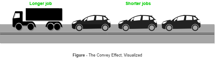 이 문제는 Convoy Effect로 언급되며, 리소스의 상대적으로 짧은 사용자들이 무거운 리소스 소비자 뒤에 대기열에 들어가는 상황을 나타냅니다.