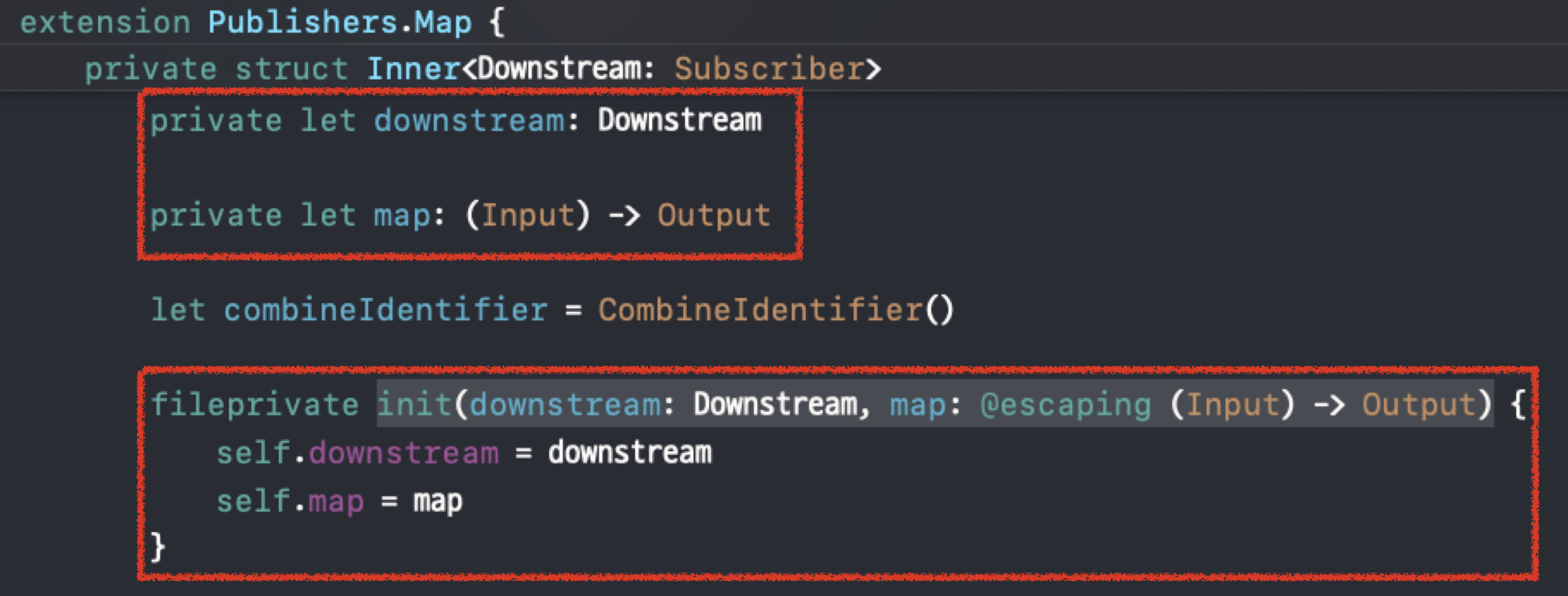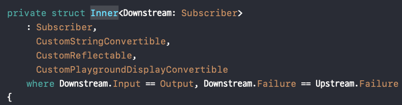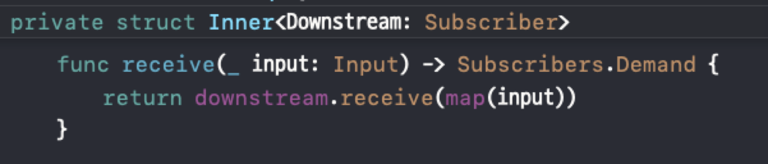 Inner는 여기서 downstream이라는 네이밍으로 Subscriber를 가지고 있고, 값을 변경하는 작업을 의미하는 클로저를 map이라는 변수에 저장하고 있습니다. 그리고 Inner또한 Subscriber protocol을 채택하고 있기 때문에 Subscriber입니다.