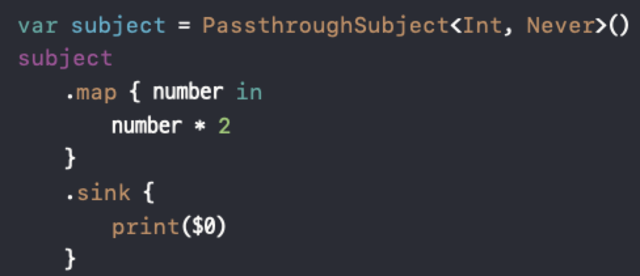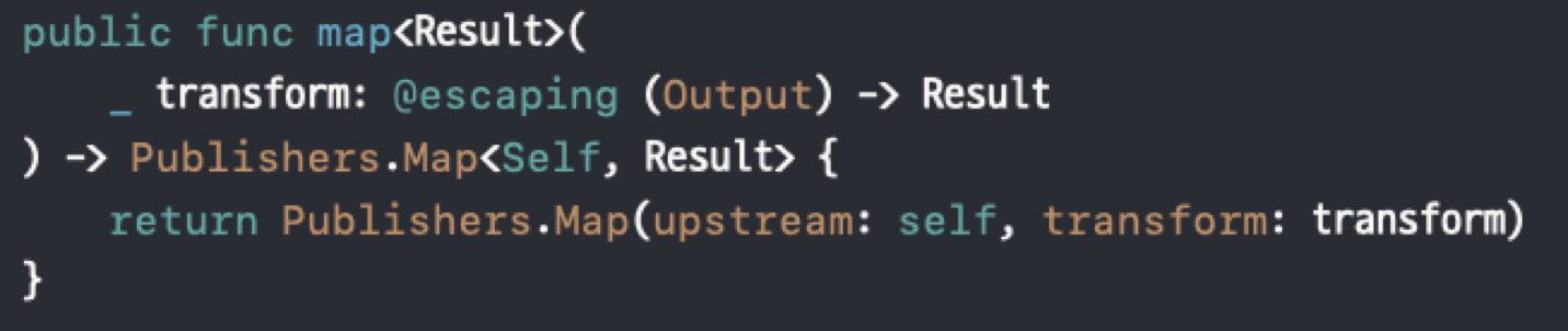 - 이 때 "map 메서드를 호출한 Publisher(PassthroughSubject) self"와 "값을 변환하고자 하는 작업의 의미를 가진 @escaping closure, transform"를 가지고 Publishers.Map이라는 구조체를 만들고 있구나~