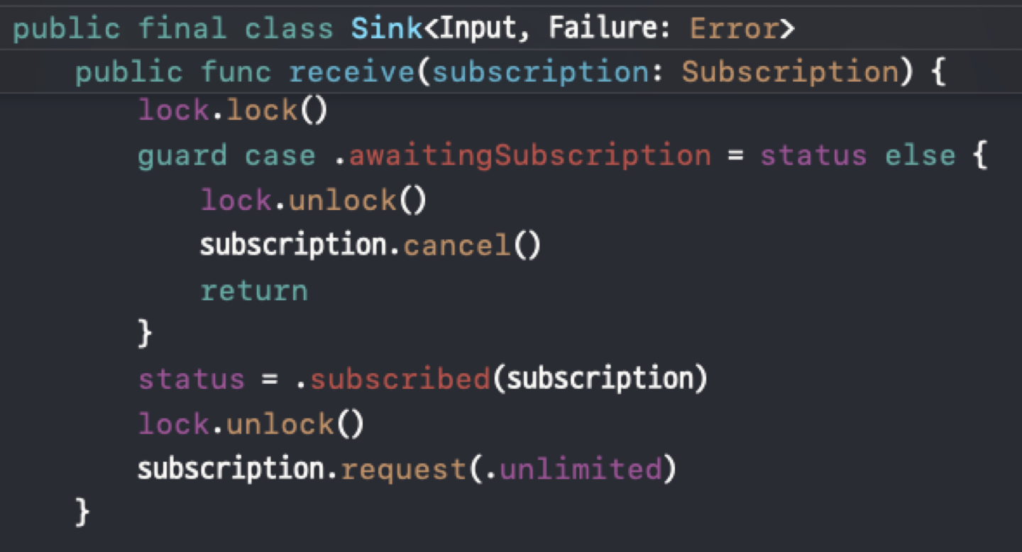 다음으로 살펴볼 메서드는 Sink가 구독권을 받는 것이므로, Sink의 receive(subscription:) 메서드입니다.