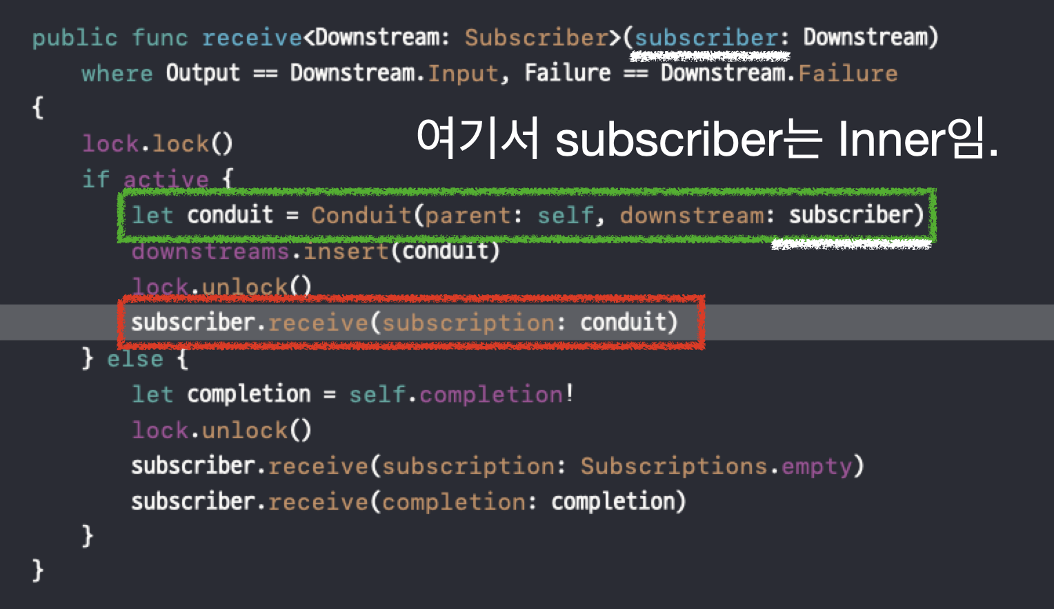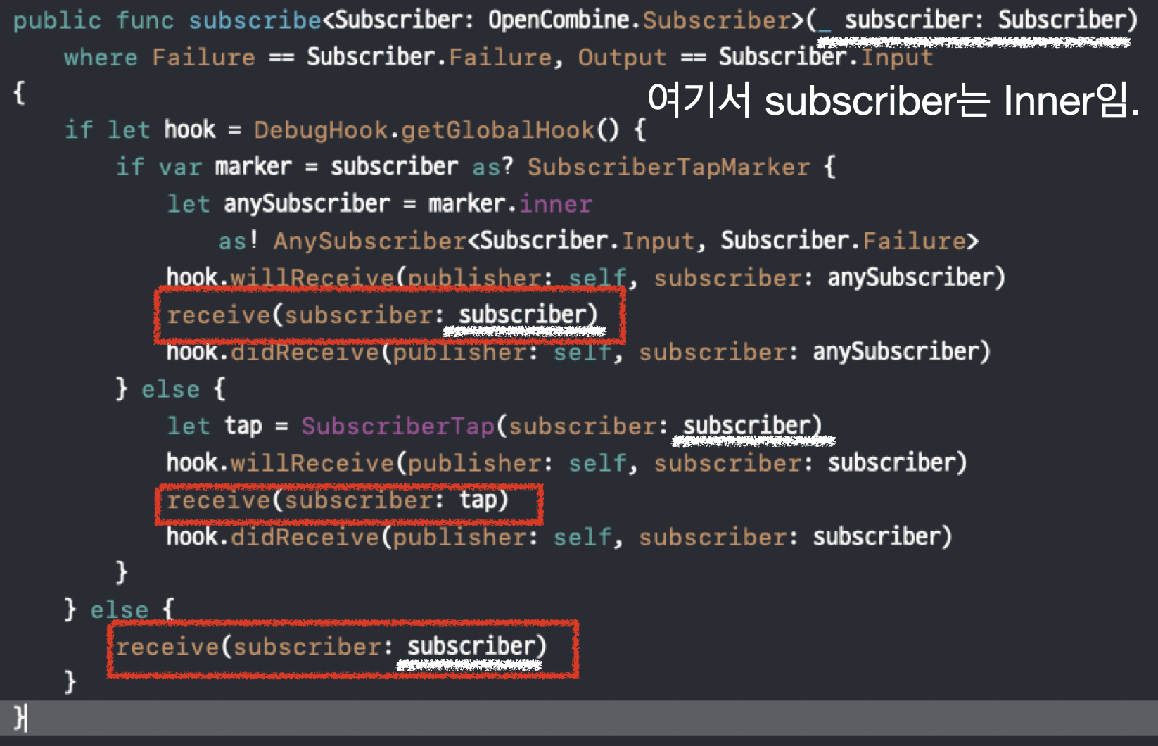 다음으로 봐야할 메서드는 Inner에 있는 receive(subscription:) 메서드입니다 !