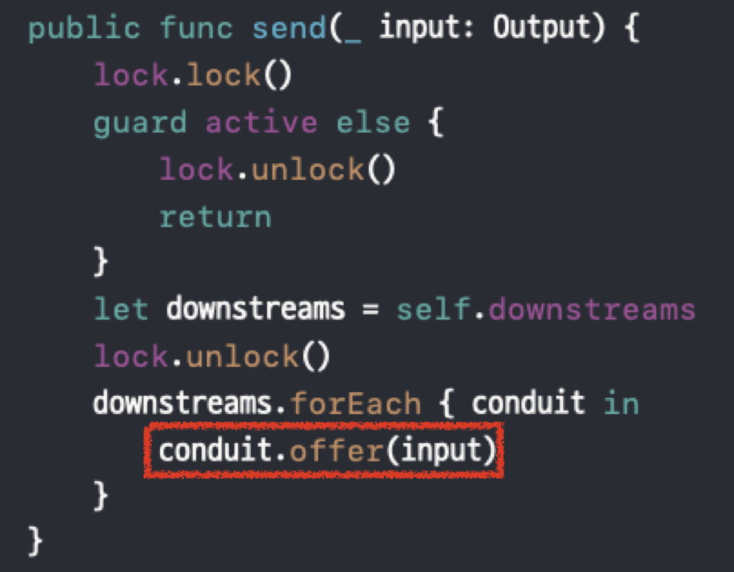 Subject가 가지고 있는 subscription list를 순회하면서 conduit에 offer메서드를 호출하고 있습니다.