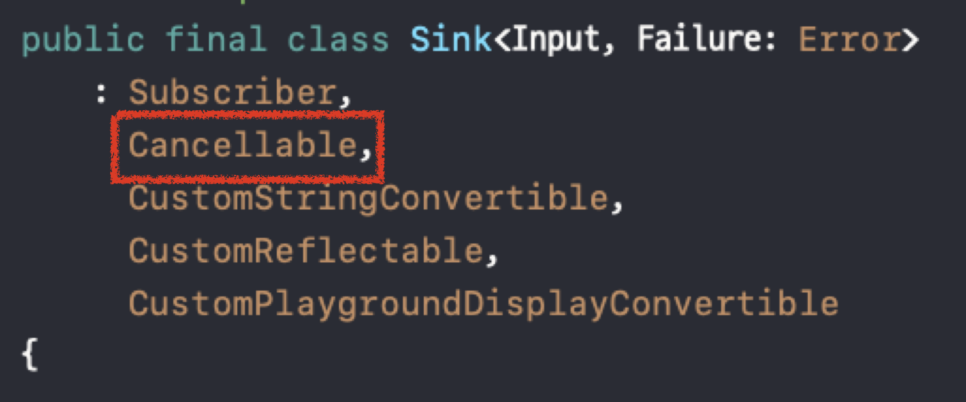 이를 통해 알 수 있는 사실은 AnyCancellable의 init에 넣어준 Sink Subscriber는 Cancellable을 채택하고 있다는 것입니다.