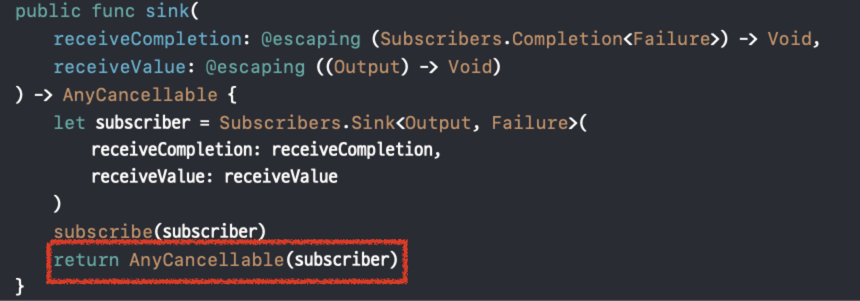 즉, 우리가 예제에서 cancellable.cancel() 했을 때 처음 실행된 것은 AnyCancellable의 cancel메서드이지만, 그 구현부에서 다시 Sink subscriber 객체가 가지고 있는 cancel() 메서드를 호출한 것 입니다.