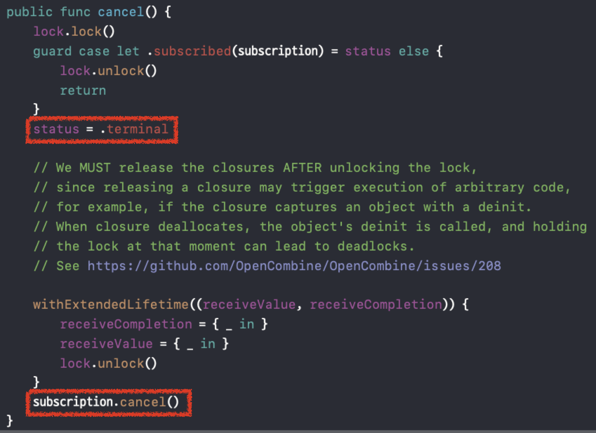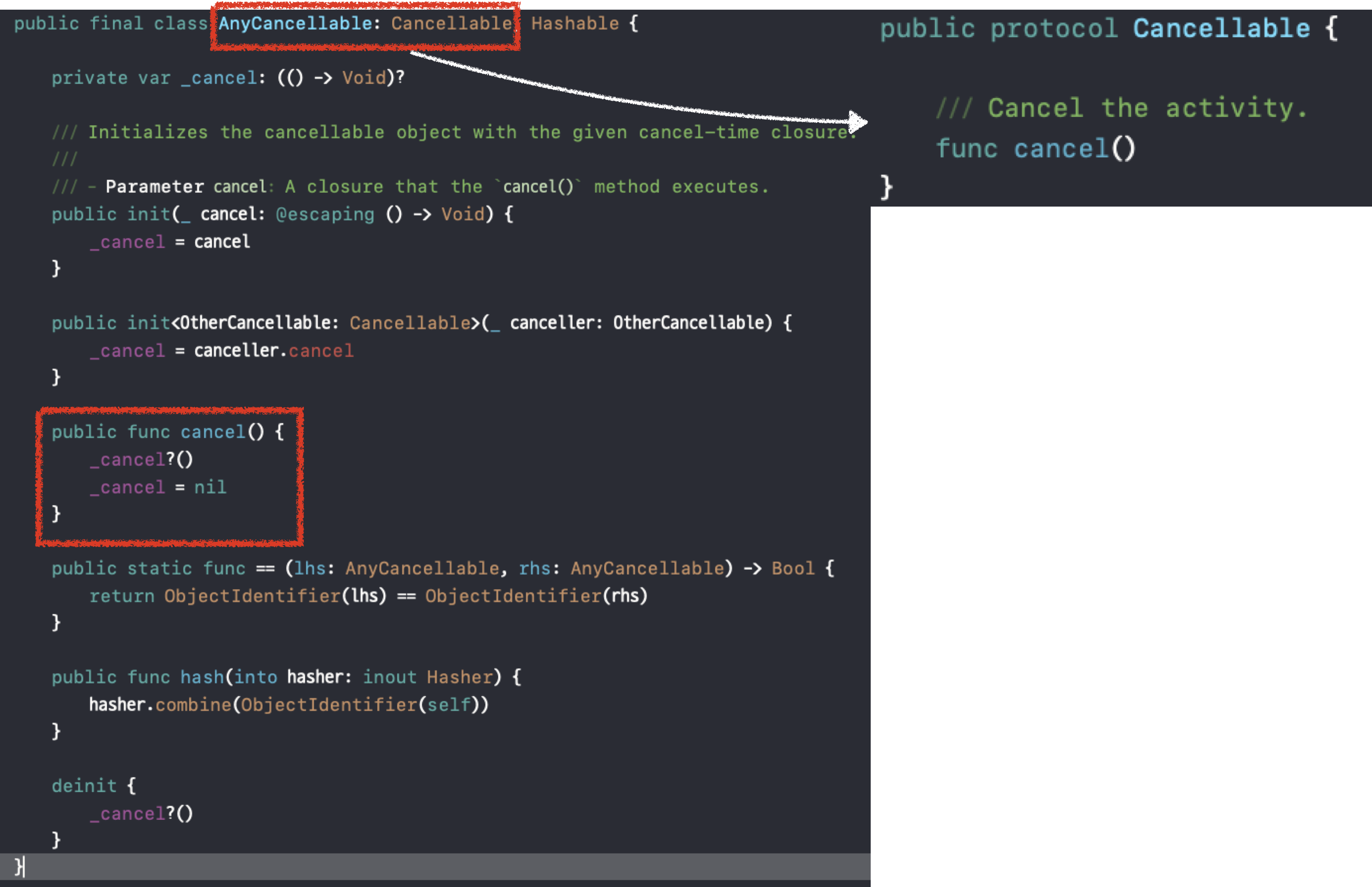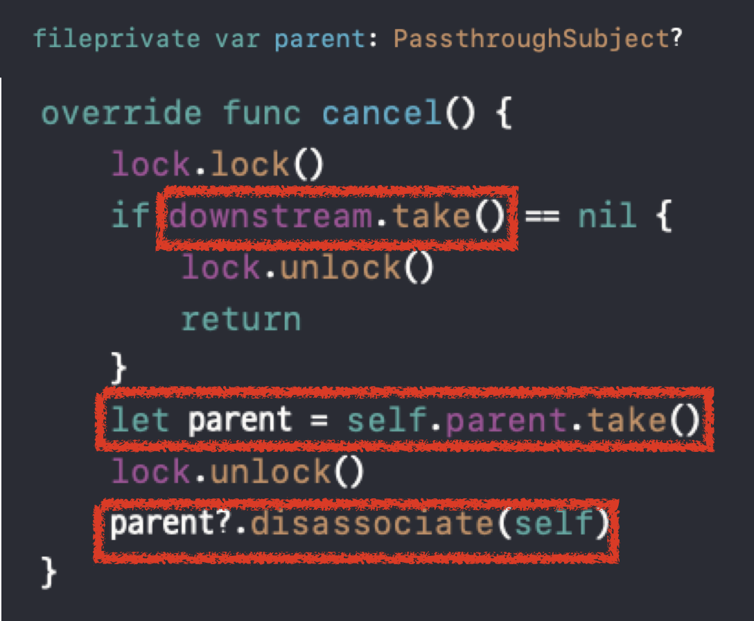 cancel의 구현부를 살펴보면 앞서 주입받은 객체의 cancel 클로저를 저장했던 _cancel 변수를 실행하고 해당 변수를 nil로 초기화해주고 있습니다.