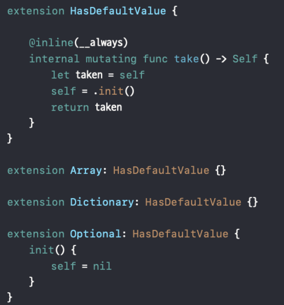 위에서 take를 사용하는 주체의 타입을 살펴보면 모두 ?가 붙어 있는 Optional type임을 알 수 있습니다. Optional에 HasDefaultValue라는 프로토콜을 채택시킴으로써 Optional type은 take 메서드를 쓸 수 있게 되었습니다.