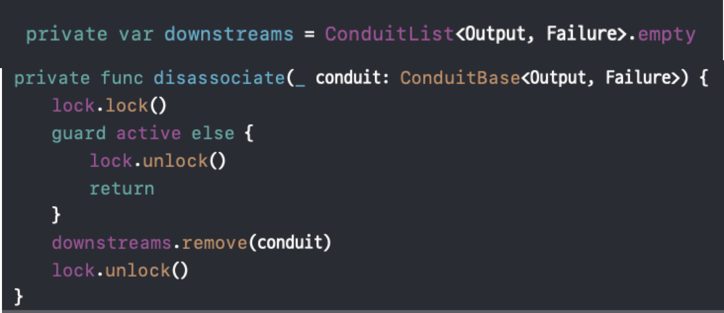그렇다면 다음으로 살펴봐야할 구현부는 PassthroughSubject의 disassociate메서드가 되겠네요. 이 때 인자로 self, 즉 Conduit(subscription) 자기 자신을 넘기고 있음을 생각하고 가봅시다 !