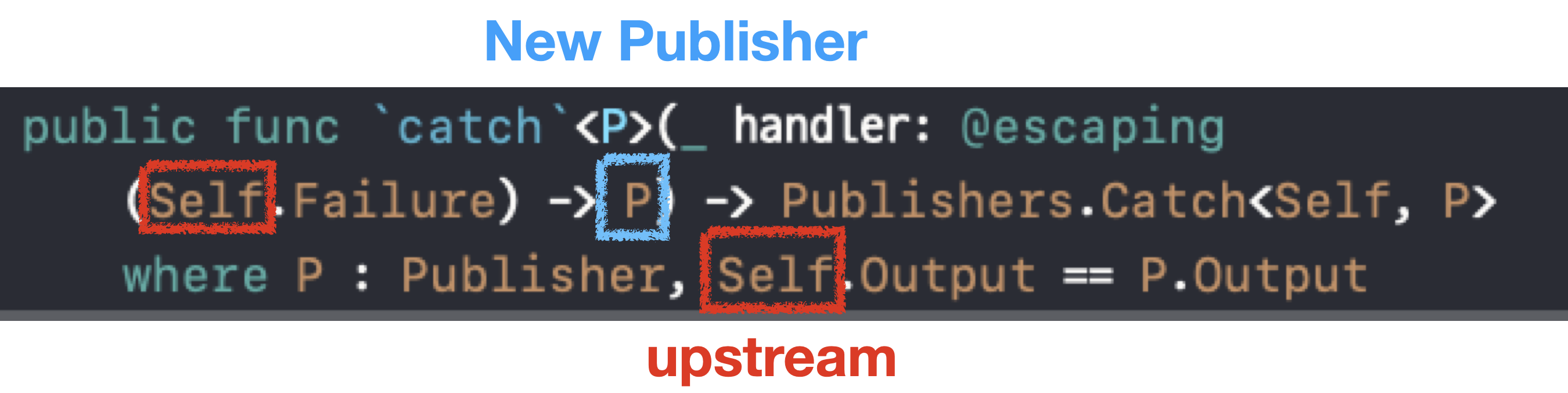 Self는 catch 메서드를 호출한 객체의 메타타입입니다. 즉, Upstream Publisher의 타입입니다. Self.Failure 코드를 통해서 upstream의 Failure 타입을 그대로 물려받는 사실을 알 수 있습니다.