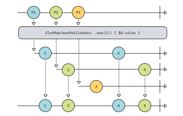 flatMap은 여러 개의 상위 Publisher들을 하나의 하위 Publisher로 펼치거나, 넘어온 value들을 하나의 Publisher로 flat시켜서 내보냅니다.