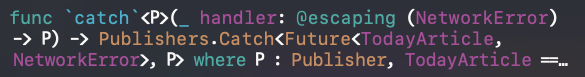 코드와 함께 살펴봅시다. catch 뒤에 있는 후행 클로저는 handler에 해당됩니다. 여기서 handler의 Return타입은 위에 코드에서 Just<TodayArticle, Never>가 됩니다. 즉, P의 type placeholder가 Just<TodayArticle, Never>가 되는 것 입니다.