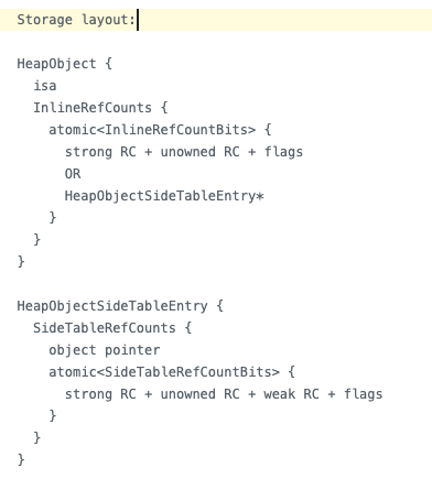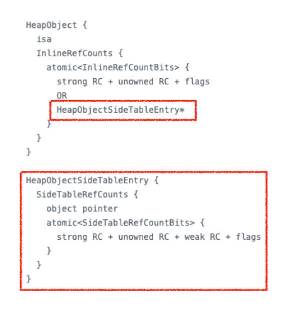 HeapObject를 살펴보면 안에 InlineRefCounts가 있고 안에 위에서 언급한 strong RC와 unowned RC가 보이네요. 그런데 weak RC는 어디에도 안보입니다. 하지만 HeapObjectSideTableEntry* 포인터가 가르키는 곳에 가보면 strong, unowned와 weak RC가 보이네요. 그리고 HeapObjectSideTableEntry* or Strong RC + Unowned RC로 되어있는 것으로 보아 line으로 strong과 unowned RC를 관리하던지, 혹은 SideTableEntry를 통해서 모든 RC들을 다른 곳에서 관리하는지 둘 중의 하나의 방법으로 동작하는 것을 의미하고 있습니다.
