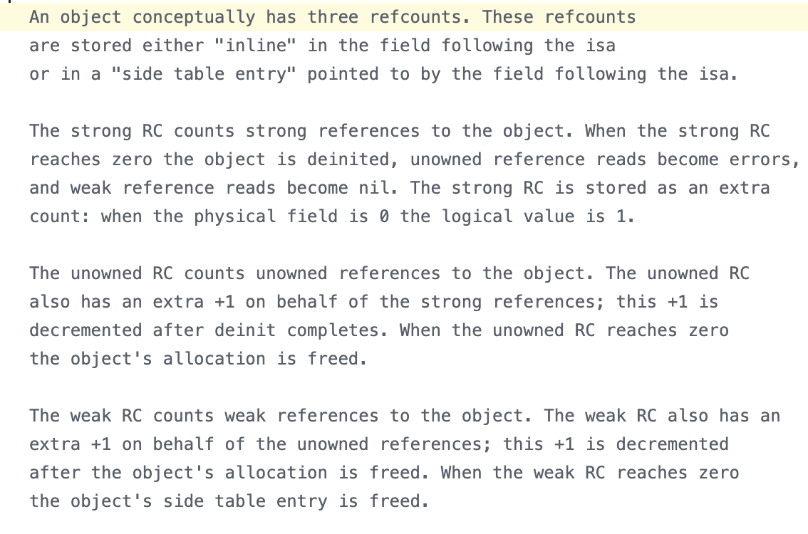 RefCount의 주석을 참고해보면 알 수 있듯이 Reference Count의 종류는 strong, unowned, weak 총 3가지로 각 각 존재합니다! 저는 reference count는 하나만 존재해서 이를 strong이면 +1 시켜주고, unowned나 weak면 그대로 두고 뭔가 이런식으로 하나를 가지고 조작하는 것이라고 생각했는데 그게 아니였습니다.