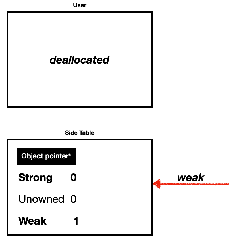 ⚠️ 주의해야할 점은, side table이 없어도 weak RC가 0이상일 수 있습니다. 위에서 언급했듯이 weak RC는 unowned rc 추가로 +1만큼을 가지고 있기 때문에 "weak가 있으면 side table이 존재한다"는 항상 참이지만, "side table이 없으면 weak RC는 0이다"는 틀린 말이 됩니다.