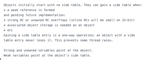 Object는 기본적으로 init될 때 side table없이 생성되고, weak reference가 생기면 그제서야 side table을 얻는다고 합니다.