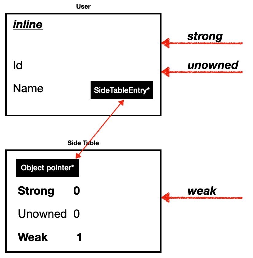 아하 그럼 weak reference가 없는 객체는 strong, unowned RC를 inline에서 관리하고 weak reference가 생기면 해당 객체의 RC를 별도의 side table에서 관리한다는 뜻이구나 !