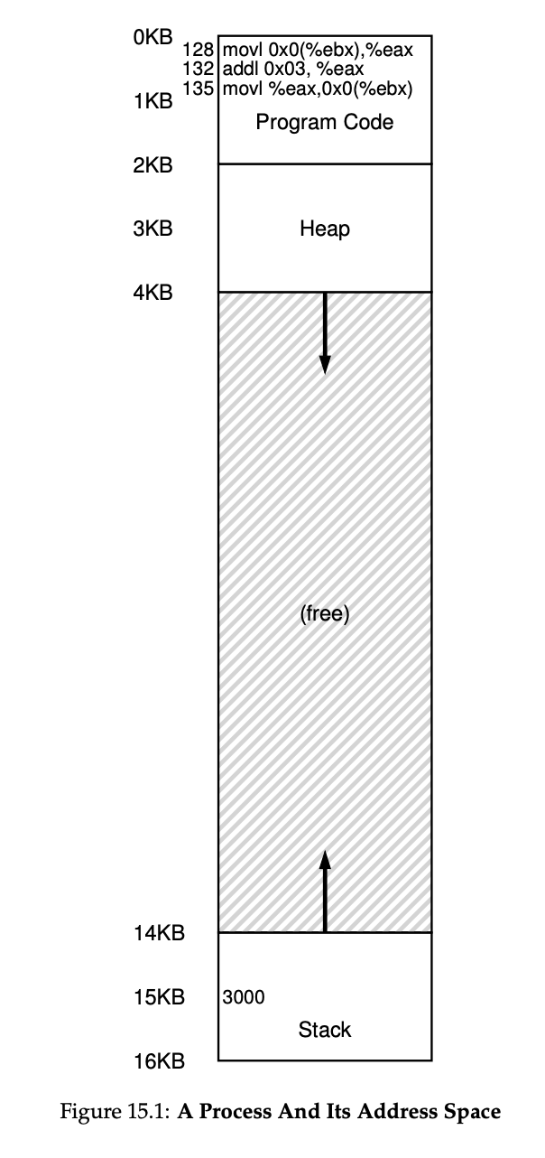 프로그램의 관점에서 address space는 주소 0~최대 16KB이고, 모든 메모리 참조는 이 범위 내에 있어야 합니다. 하지만 메모리를 가상화하기 위해, 운영체제는 이 프로세스를 물리 메모리의 어딘가 다른 위치에 배치하고자 합니다.