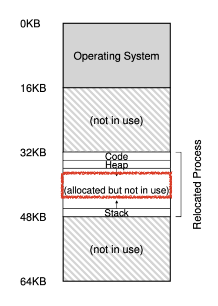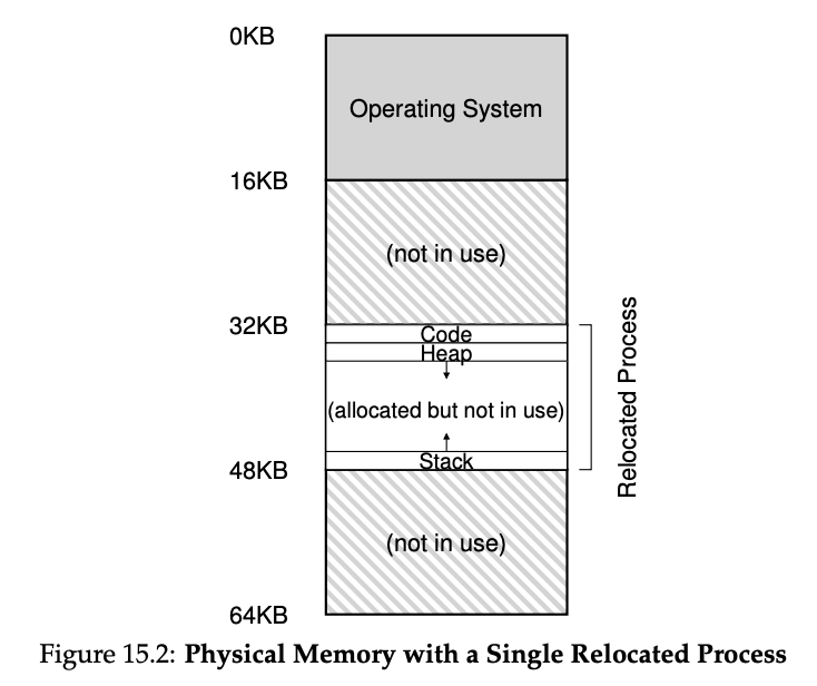 Figure 15.2 그림을 보면 운영체제는 물리 메모리의 첫번째 슬롯을 자신을 위해 사용하고, 32KB에서부터 프로세스를 재배치시켰습니다. 다른 빈 두 슬롯(16-32KB, 48-64KB)은 비어 있으므로, free list는 이 두 슬롯으로 구성됩니다.