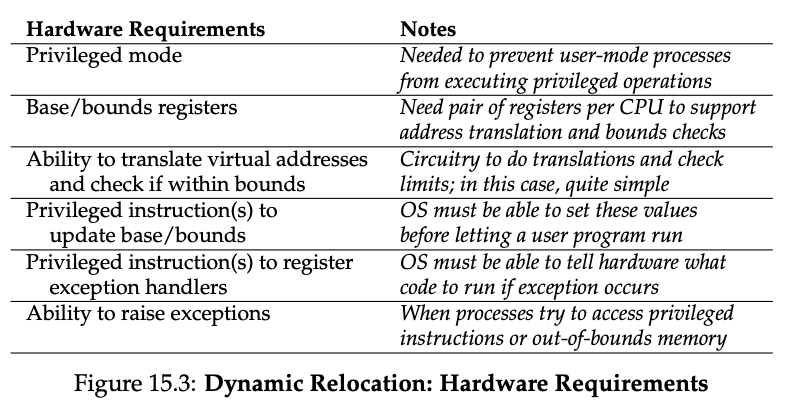 - Base와 Bounds 값을 바꿀 수 있는 특권 명령어 (kernel만 수행할 수 있는)
