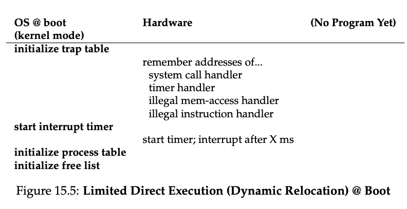 - OS: 프로세스가 여러개 있기 때문에 그것을 Table로 관리하는데 그 Table 초기화 및 비어있는 공간 free space를 free list로 관리. (나중에는 segmentation, paging을 쓰겠지만 free list로 이런식으로도 할 수 있다)