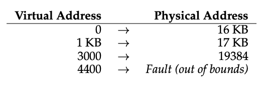 address space 크기가 4KB인 프로세스가 물리 주소 16KB에 로드되었다고 가정해봅시다. bounds가 4KB(4,096)이고, base가 16KB라는 말이겠네요. 표에서 3000을 계산하는 것을 보면 base(16KB = 16,384)에 3000을 더해 19,384라는 실제 물리 주소를 계산하는 것을 볼 수 있습니다.