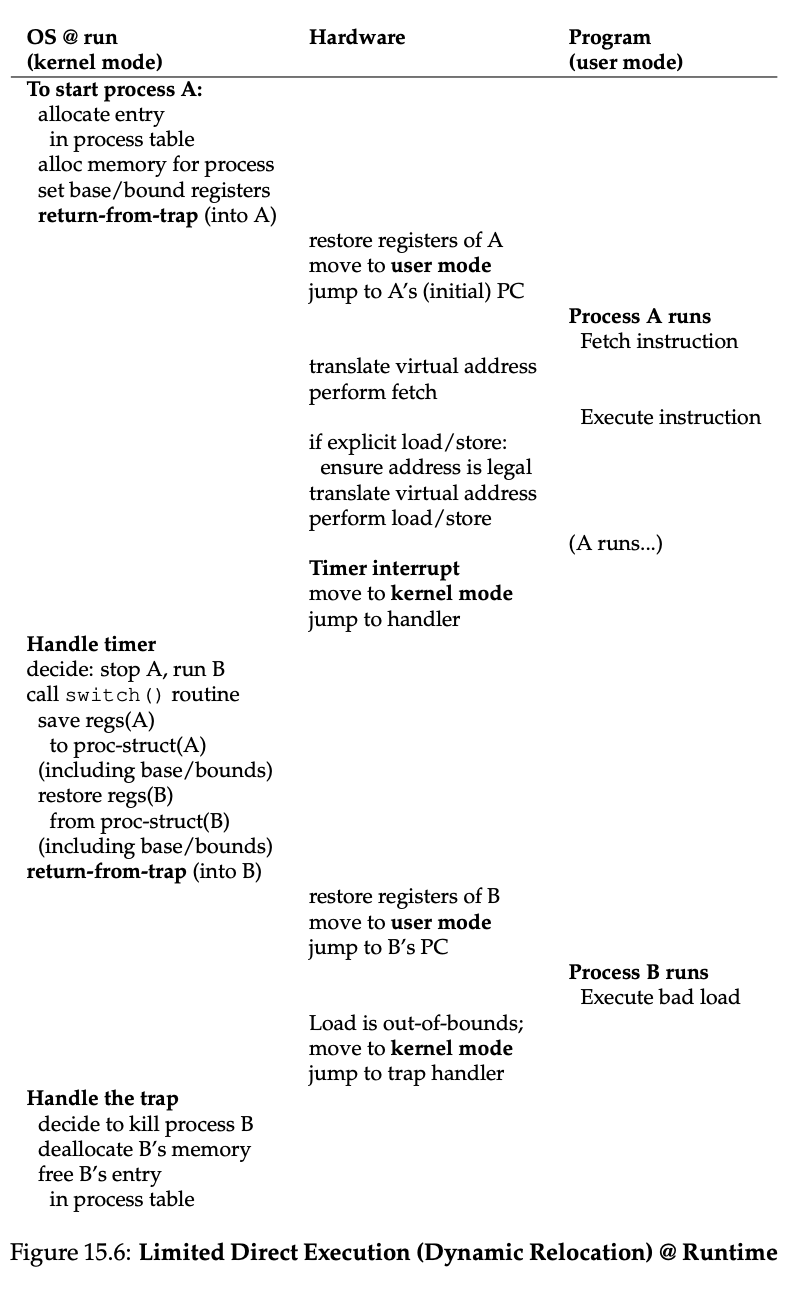 한가지 더 유의해야할 점은 프로세스가 stopped됐을 때, OS는 프로세스의 address space를 메모리의 한 위치에서 다른 위치로 쉽게 이동할 수 있습니다. 이를 위해서, 먼저 프로세스를 스케줄링에서 제외하고, 주소 공간을 현재 위치에서 새로운 위치로 복사한 후, PCB에 저장된 base register를 새로운 위치로 업데이트합니다. 그러면 해당 프로세스가 다시 시작할 때 새로운 base register에서 복원되어, 자신이 새로운 위치에서 실행중이라는 사실을 전혀 인지 못하게 됩니다.
